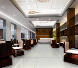 Imagen de un catálogo físico en el que se ha realizado la integración de un suelo con brillos en un restaurante. La gran cantidad de puntos de luz obliga a prestar mucha atención a los reflejos de luz y las diferentes sombras creadas por esos focos de luz.